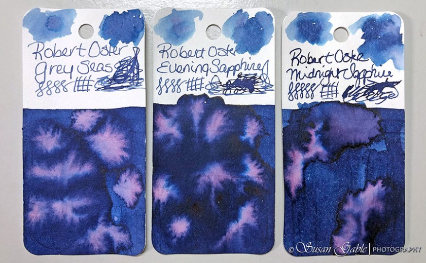 Grey Seas is a medium blue color while Midnight Sapphire is a dark blue color. Evening Sapphire falls somewhere in between the two other ink colors. It’s more prevalent in my writing on my swatch cards.