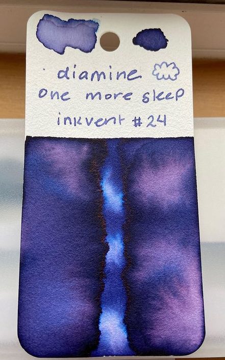 Today’s Diamine Inkvent color is One More Sleep. This is a standard blue ink. It reminds me of a blue-purple color with cornflower blue and pink underlying colors.