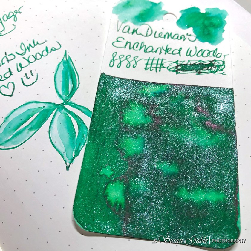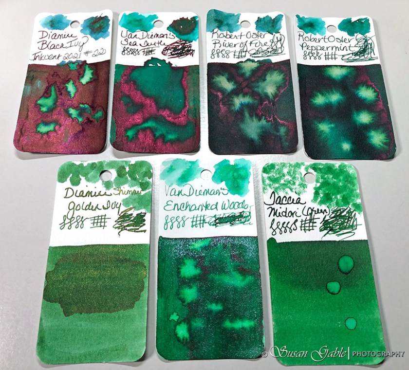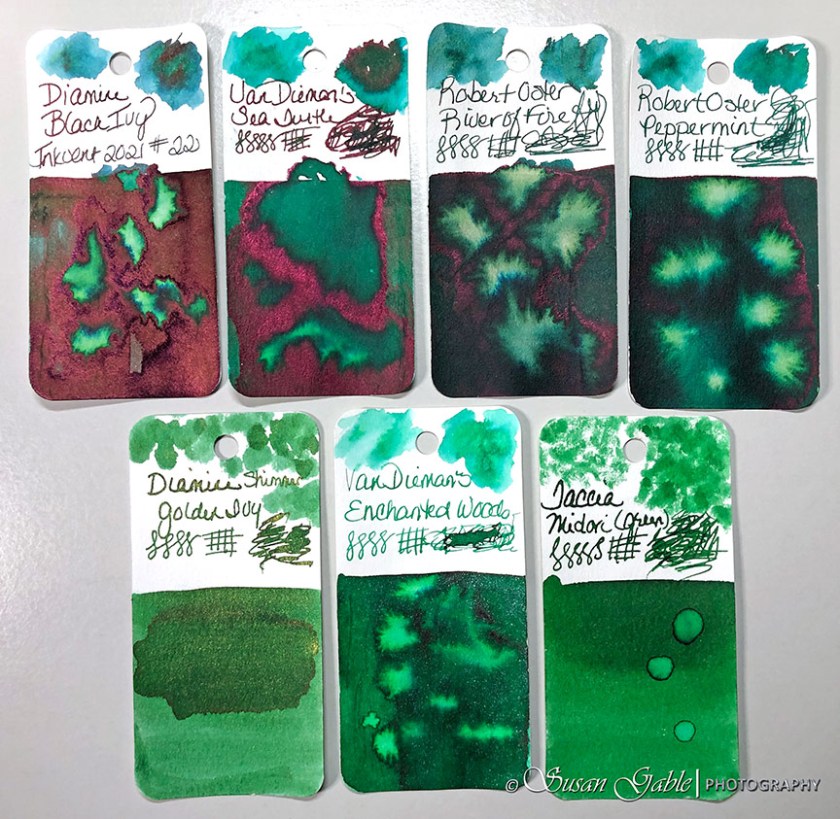 Ink swatches: Diamine Red Inkvent Black Ivy. Diamine Golden Ivy (shimmer). Van Dieman’s Ink Sea Turtle and Enchanted Woods (shimmer). Taccia Midori. Robert Oster River of Fire and Peppermint.