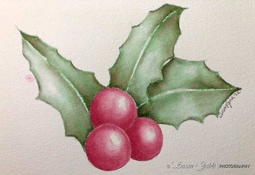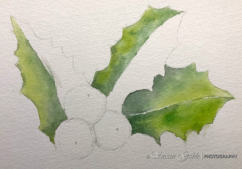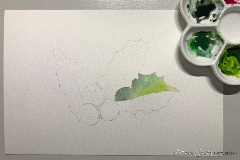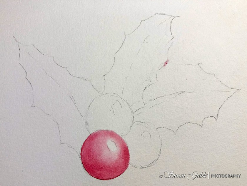 I quickly pencil sketched another holly and berry on my watercolor paper. Instead of working on the leaves first, I decided to start with the berries.