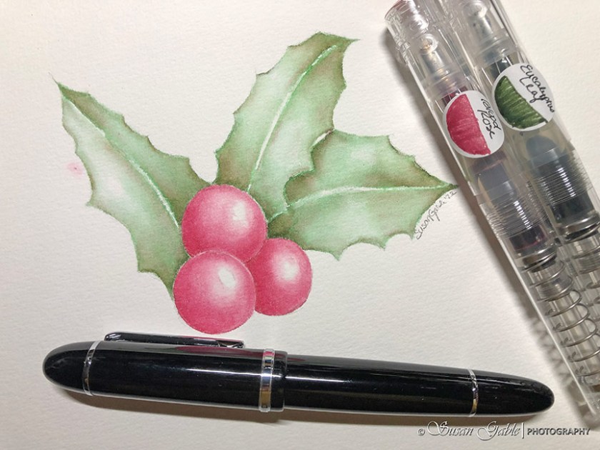 After I finished my watercolor painting, I went ahead and filled a bunch of my TWSBI GOs with several different ink colors. I was anxious to sketch something with my pens. A light bulb went off in my head and I thought I would create another holly and berry sketch using my GOs with fountain pen inks.