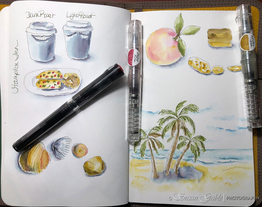Here’s an example of a quick sketch I created in my art journal. I had about ten minutes to sketch a few things and not enough time to add my fountain pen inky colors to all of my sketches. I find it’s okay to leave out the colors and add them back in for another day. I can also go back into my travel log and find other things to add to my sketch and add the colors when I have the time.