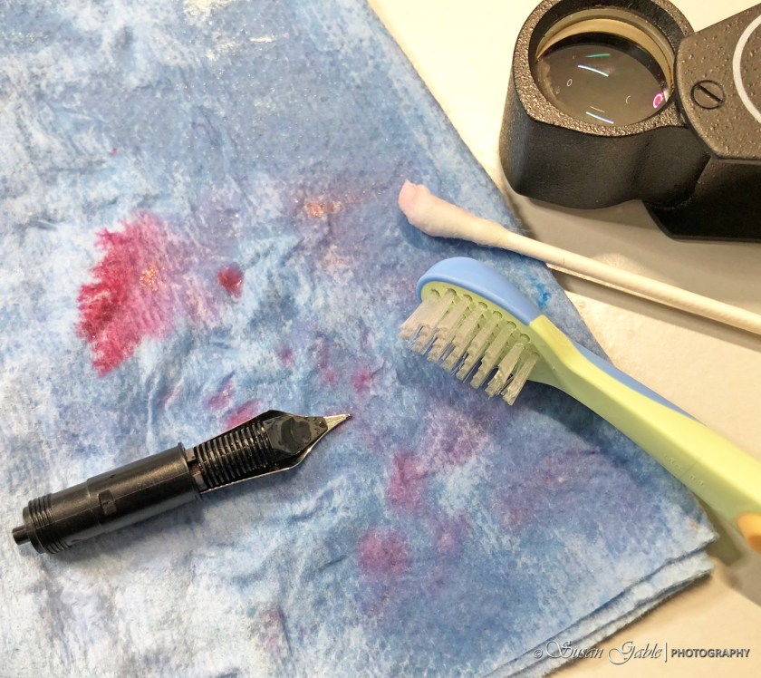 Cleaning Note & Tip: When I’m refilling the same ink into the same pen, I do clean my pen before refilling. Especially, when I’m using shimmering inks. I place a towel under my pen (with feed facing up) and I use my soft toothbrush dipped in water and gently clean out the feed and the underside of the nib. I will dip my toothbrush several times into water and then onto my feed/nib. The towel underneath will pull the water and remaining sparkly particles out from the nib. I’m often amazed how much shimmering particles come out of the feed/nib.