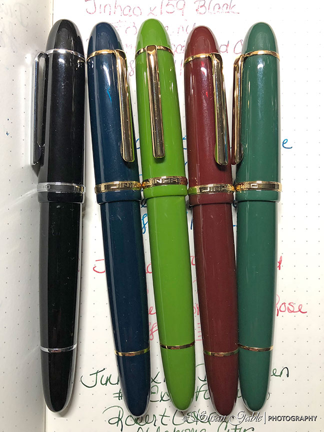 Pens: Jinhao x159 in Black, Dark Blue, Avocado Green, and Wine Red with Fine nibs. Jinhao x159 in Dark Green with Extra Fine nib.