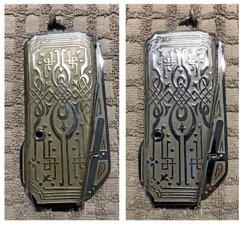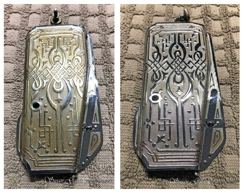 I must have spent an hour cleaning and polishing up the scrollwork on this plate. I’m glad I took a picture as I can still see some yellowish-grime along the lower edge of the plate. Looks like it needs a second round of light scrubbing and polishing.