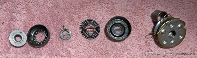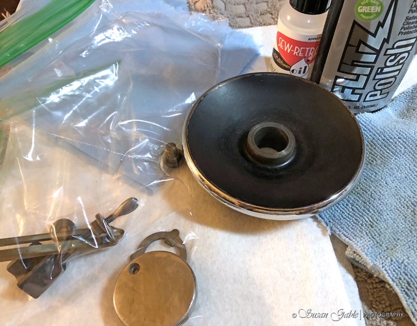 Here’s what I removed from my machine: hand wheel, stop-back motion knob, hand wheel washer, and stitch regulator (bagged) waiting to be cleaned and polished.