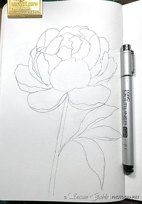 I dove right in and sketched a quick flower. I started my peony drawing with a pencil and used my Copic pen (0.1) to draw the final lines/shapes I wanted to keep.