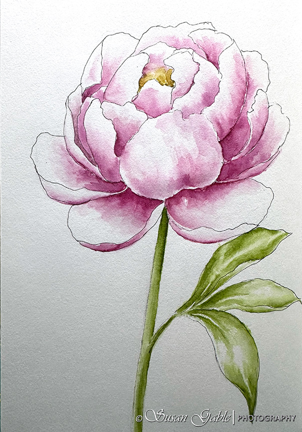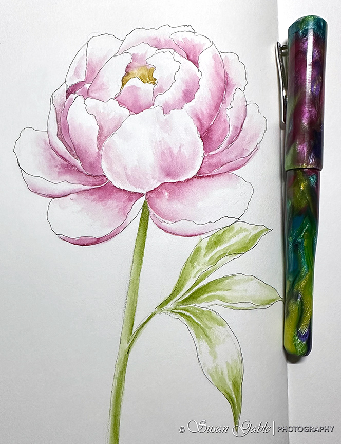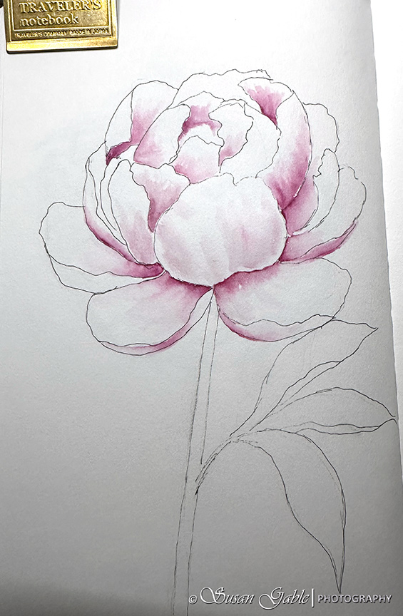 I already knew what inky color I was going to use for the flower: Persian Princess. I drew a few lines around the shapes or darker areas and used my water brush to pull out the first layer of color. I let this layer dry completely before creating the next layer of color.