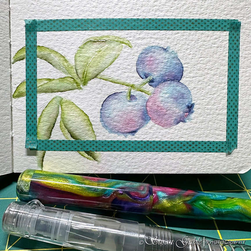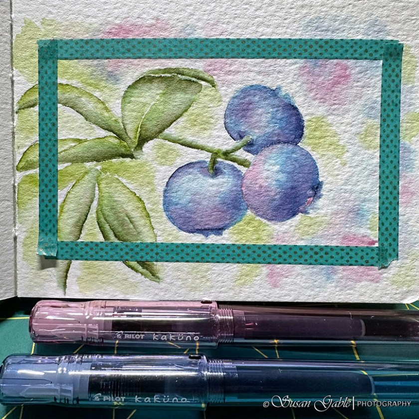 Inks used for Blueberry sketch: KWZ/Galen Leather Prairie Green. Robert Oster Bless Your Heart, Midnight Sapphire, and Eucalyptus Leaf