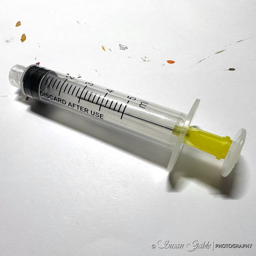 After the syringe is cleaned and empty, I unscrew the blunt needle and store it in the syringe. I also pull out the plunger a bit to help air out the tip of the syringe. It typically takes an hour or two for the syringe to dry out.