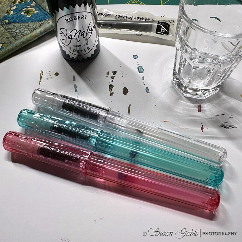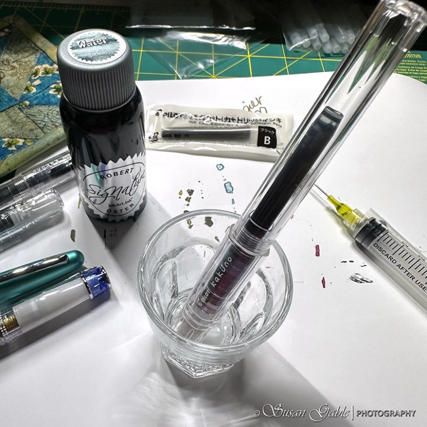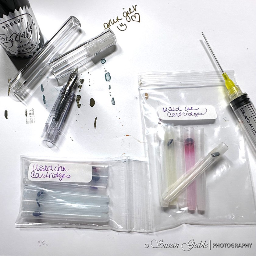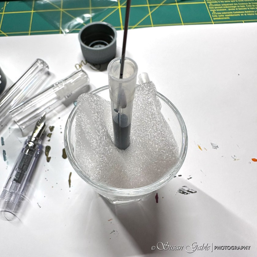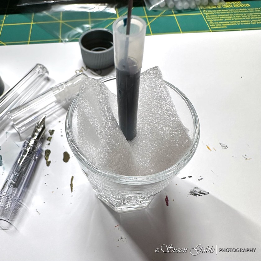 Tip #1: To help keep my artistic juices flowing, I store a few of my empty cartridges in my clean fountain pens. That way, when I’m ready to use my pen, I’m not wasting valuable time digging around my studio looking for an empty cartridge or converter. Does that sound familiar?