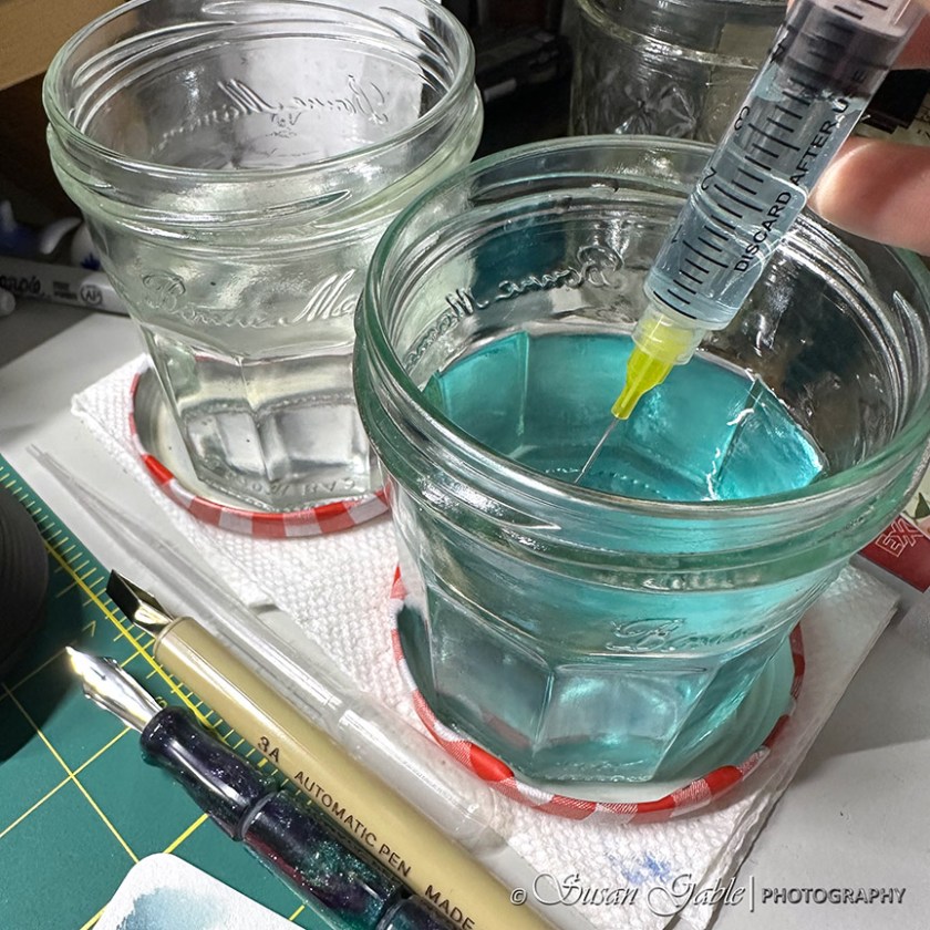 Tools: Blunt tip syringe. Bonne Maman preserve jars. Shot glass. Col-o-ring Ink Testing Book.