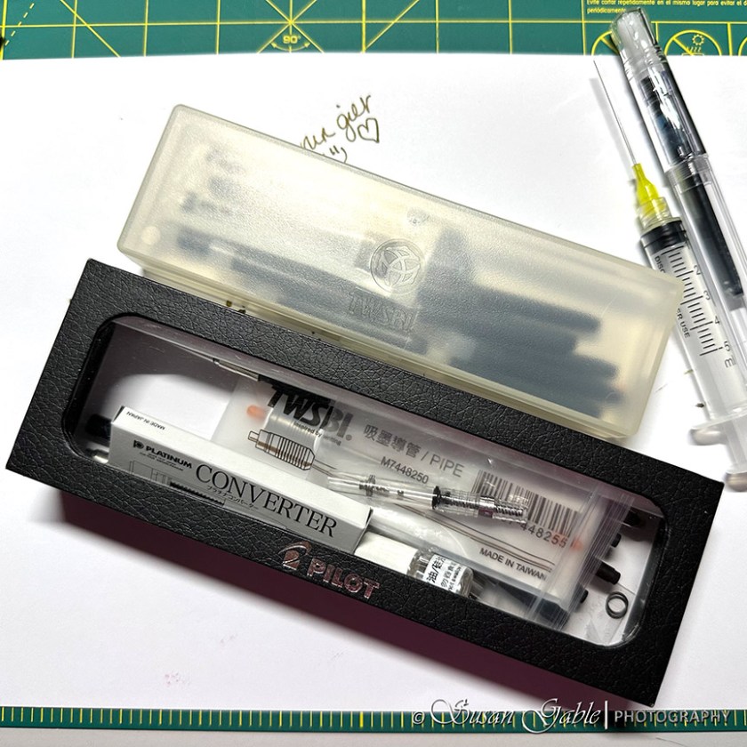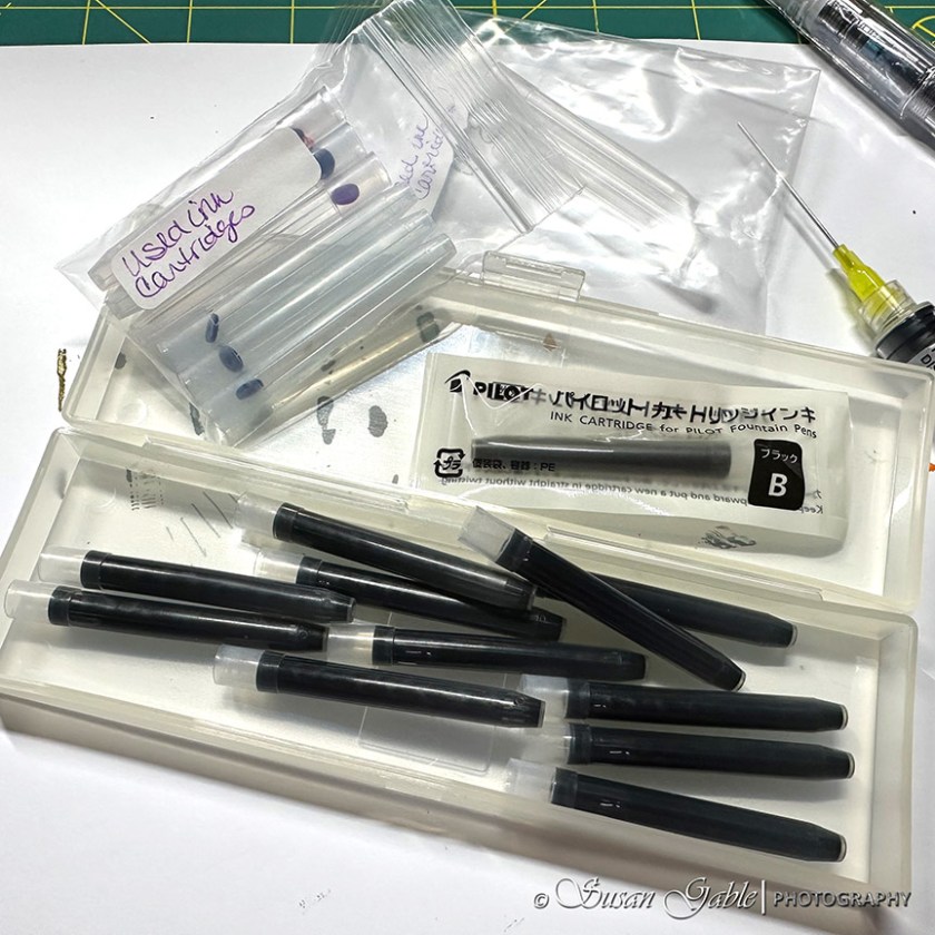 I use/reuse the included (Pilot) ink cartridges. I’m sure folks out there in the fountain pen world have tossed the “included” black ink cartridges into a container/box or even the trash. Do not throw them away!