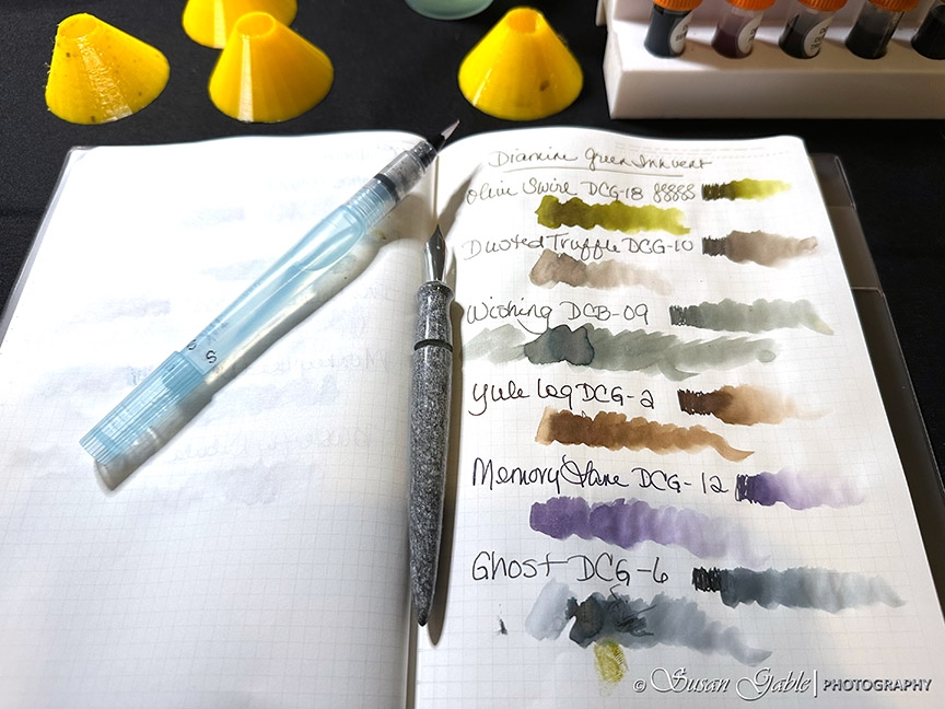 I was in desperate need of a snack break and headed down to the ink testing area on the lower level. There were two other pen folks creating swatches and it was so quiet and peaceful. I spent an hour swatching ink colors that looked interesting to me or had potential to use for sketching. I remembered to munch on my gluten-free snacks that I brought with me. You know. To keep my energy level up. For more wish list shopping.