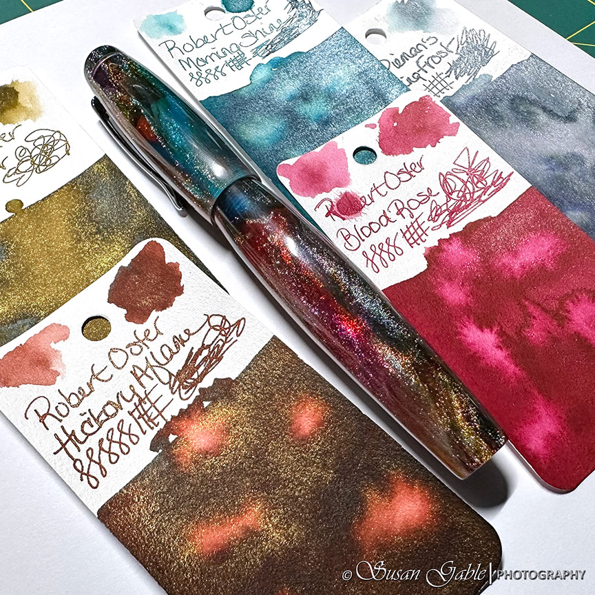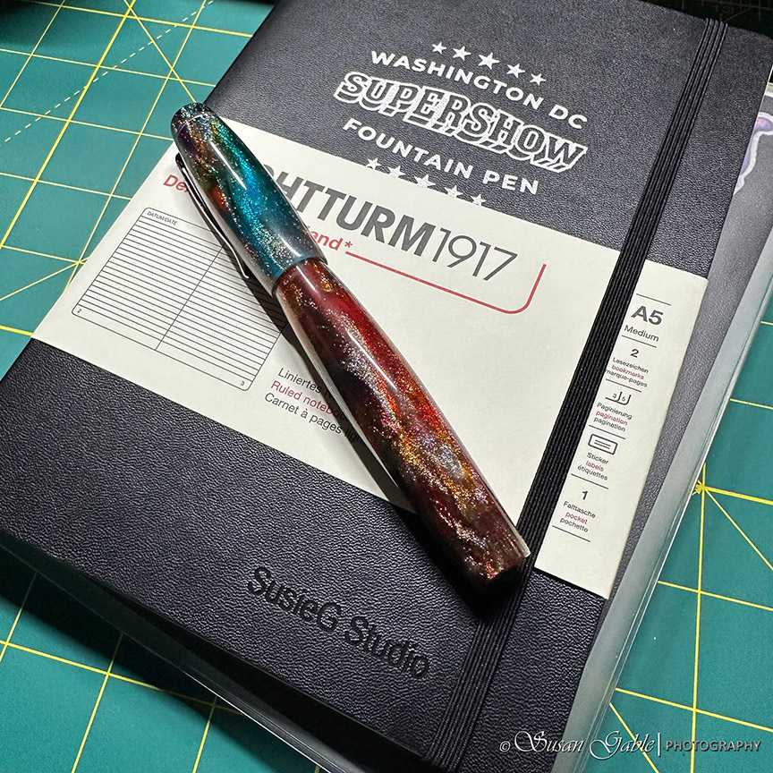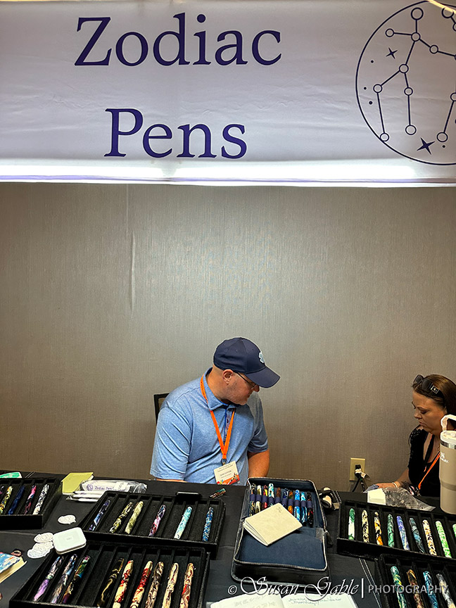 Two hours later, I make my way to a very crowded pen-maker’s room #2. I quickly say “hello” to a several pen makers as they are busy helping customers and selling their beautiful pens. I head over to another exhibitor on my wish list, Zodiac Pens. O. M. G. I zeroed-in on one of Bart’s pen trays that displayed his Cancer pen models which also happens to be my zodiac sign. I saw a colorful and extremely sparkling pen that called out to me. You might have heard it: Susie G…buy me! Hahaha! I held this beautiful pen in my hand and the first thing I noticed was how comfortable it felt. The curves of the pen fit naturally in my hand. I also noticed how smooth the transition was from the section to the body of the pen. The pen also had a clip. It was beautifully made. I was getting that tingling-pen feeling and knew I was going to become one with this pen.
