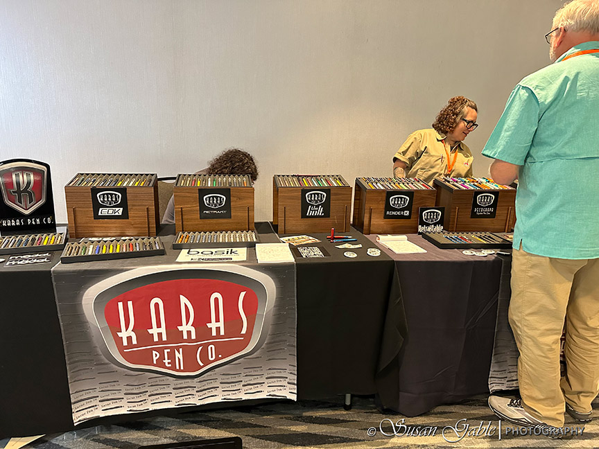 I walked around for a bit and gave my eyes some time to recover from my pen purchase. I made my way over to the Dromgoole’s/Rickshaw table in the large ballroom called room #3. Yes, I’ve already created a separate blog post about my new Bansai bag. See the post here. I cannot say enough about this bag. There’s plenty of pockets and holds a lot of my pen & ink art supplies.