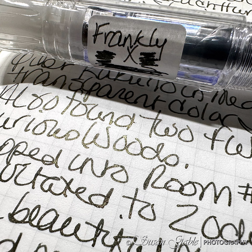I made a stop or two or three or four at Federalist Pens (Friday & Sunday) to visit with Frank and Nadine. I picked up Frank’s latest collaboration with Robert Oster Signature Ink. Frank was celebrating 10 years with his new ink called Frankly X. Frank handed me his pen to try out the ink. The first thing I noticed was how smooth the ink wrote. The second thing I noticed was the bronze sparkles on my paper. Frankly X is a true black ink color with shimmers that writes incredibly smooth.