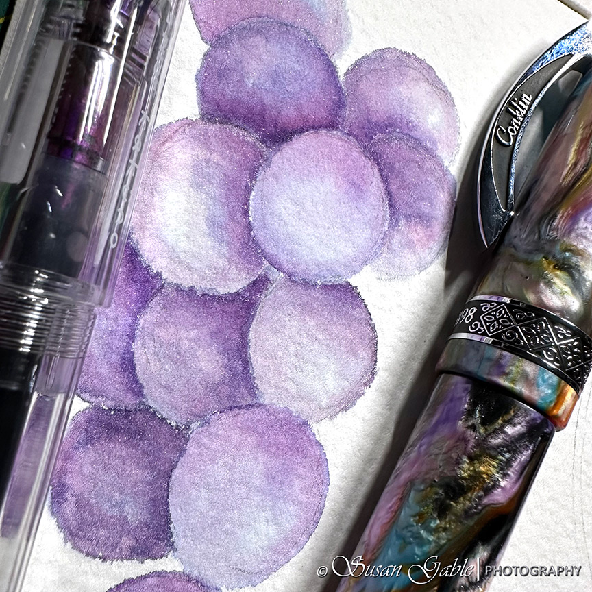 This ink is a lovely purple color with pinky-purple shimmers. The shimmers remind me a raspberry color. Absolutely gorgeous!