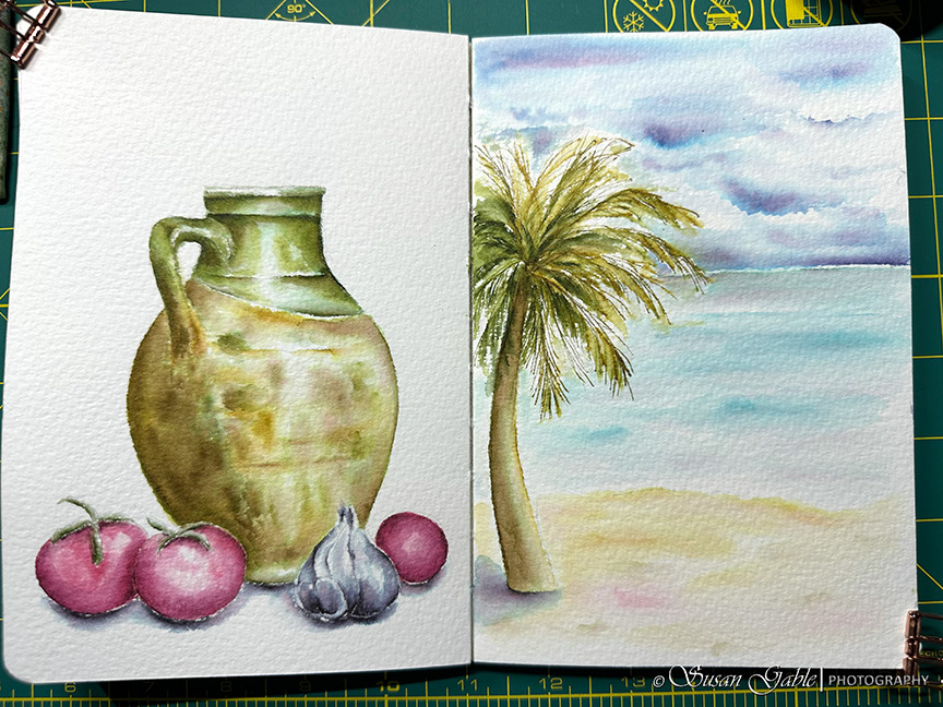 A lot of times my drawings are random. I just fill up each page or side and not necessarily follow a theme. On the left page, it was a practice piece to draw a handle. I was tired of drawing coffee mugs with handles and thought the jug handle would be fun. The beach scene on the right page was an attempt to fill a page with pen & ink wash color.