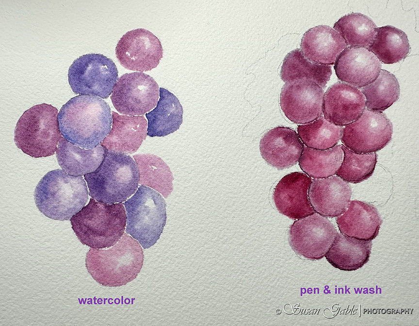 I had a scrap piece of Arches watercolor paper on hand. I created this sample artwork to show the difference of what I can do between the two art mediums. With watercolors I mixed the basic colors to produce the colors you see in the grapes on the left. For my pen & ink wash on the right I used Bless Your Heart with several layers of colors. The Arches paper is tough and can handle numerous layers of paint or ink.