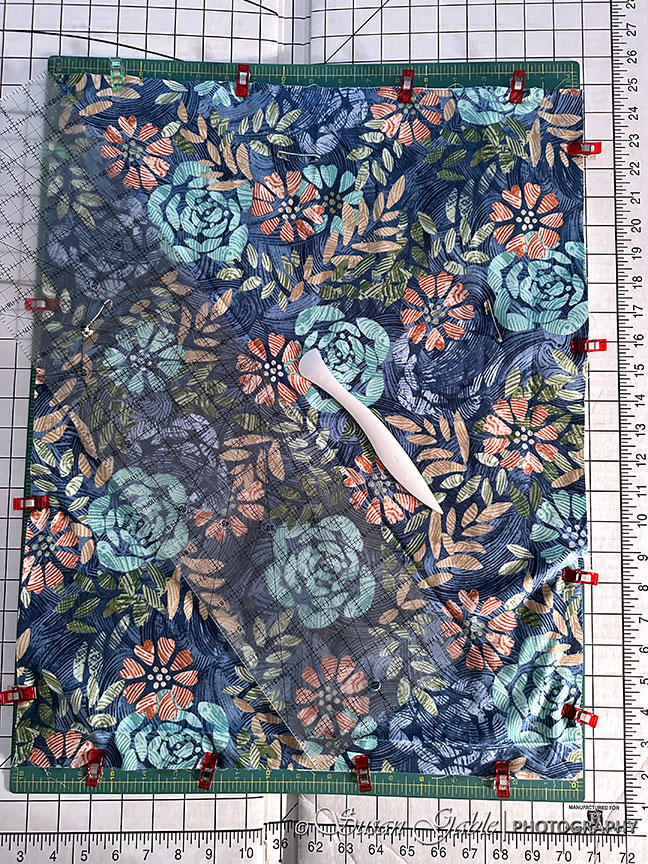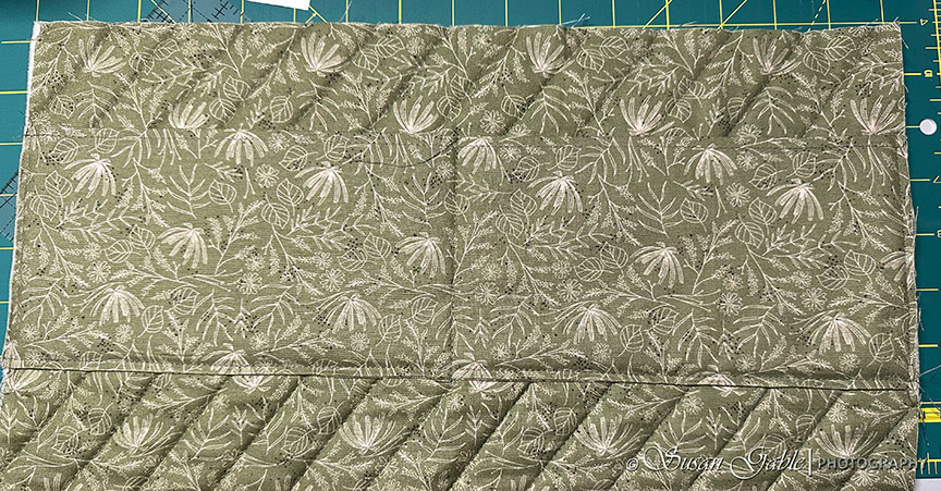 Here is my fabric “sandwich” which includes the main fabric, a layer of soft and stable, and my lining. My fabric sandwich is the largest size I’ve worked on and it barely fits my green cutting mat. Using my Hera marking tool, I scored a single line into my fabric. This will help guide me when I sew my first quilting line.