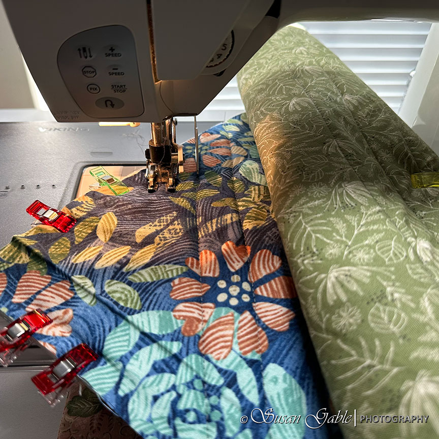 I’m sewing the quilting lines on my fabric sandwich. The throat of my sewing machine is not that wide and so I had to roll up my fabric by hand to fit in the space.