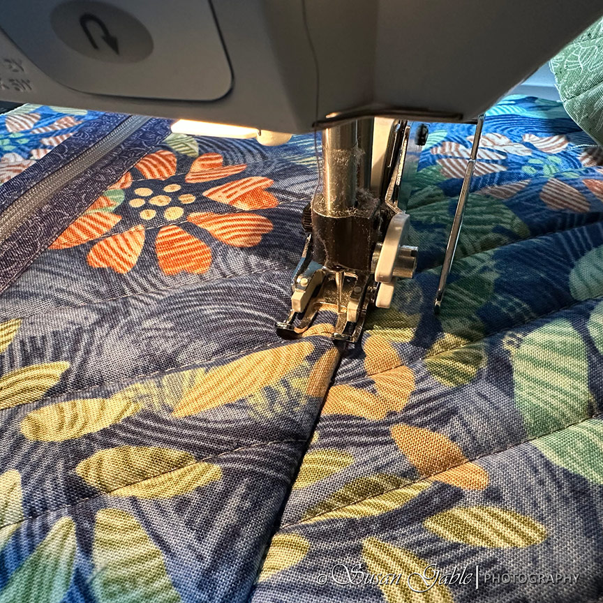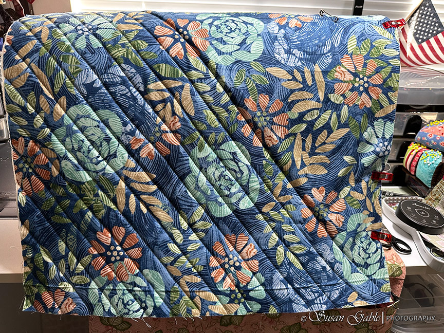 Whew! One diagonal side of quilting completed. I turned my fabric and quilted the other end.