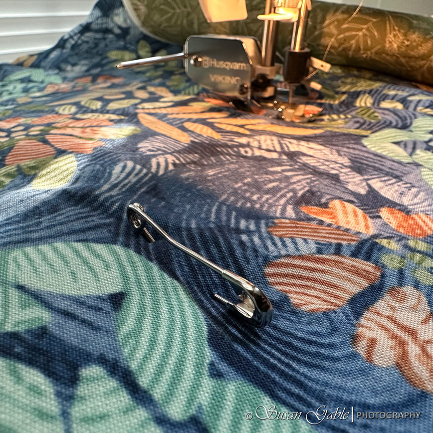 I used my curved quilting safety pins to hold my sandwich together while quilting. I had strategically placed my pins on the sandwich before I started my quilting process. The curved safety pins prevents my three layers of fabrics from shifting.