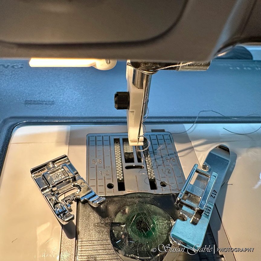 I love using my narrow zipper foot. It looks like a “ski” and with two mounting bars. I can attach my foot with the opening on the left side.