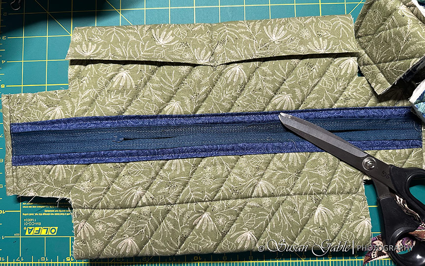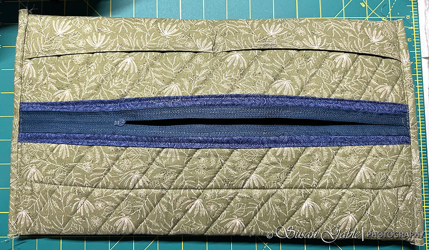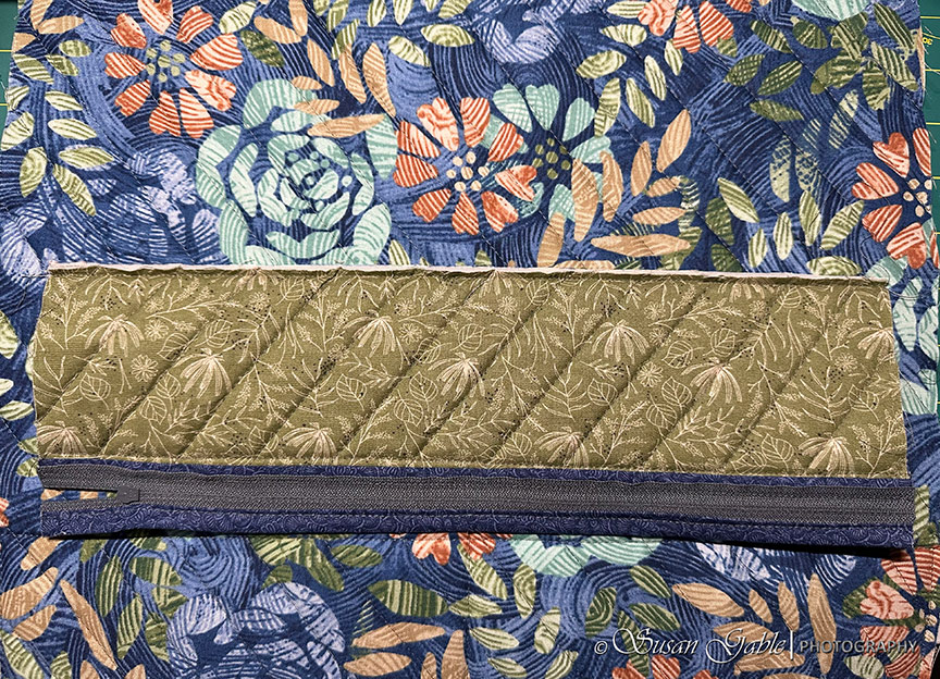 I can turn it around and install it with the opening on the right side. This allows me to sew around the zippers and binding edges and produce clean and even topstitches.