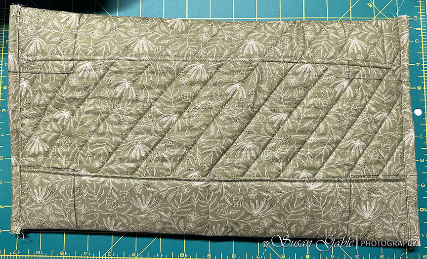 My quilting is completed. I checked the edges of my fabric and it’s not too bad. I straightened and cleaned up the edges by trimming them off with my rotary cutter. Now I’m ready to cut out the outside zipper pocket and the body of the bag.