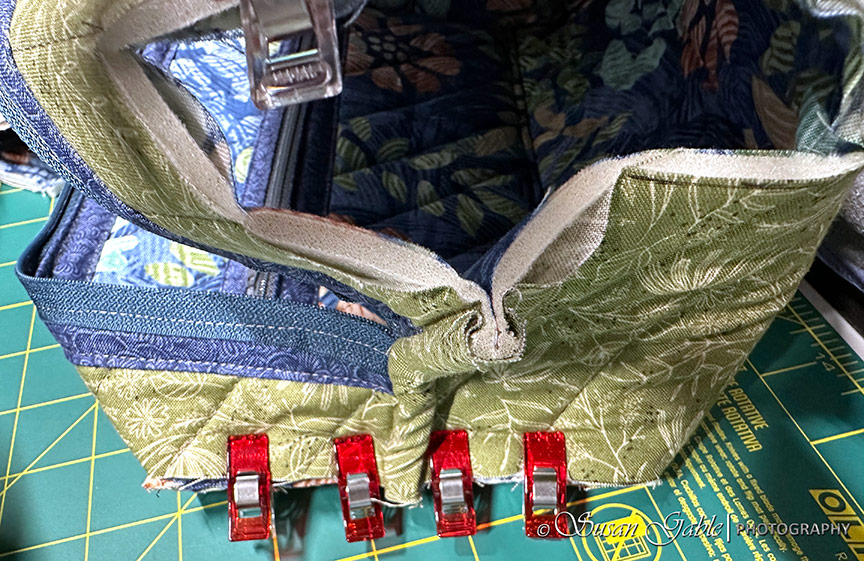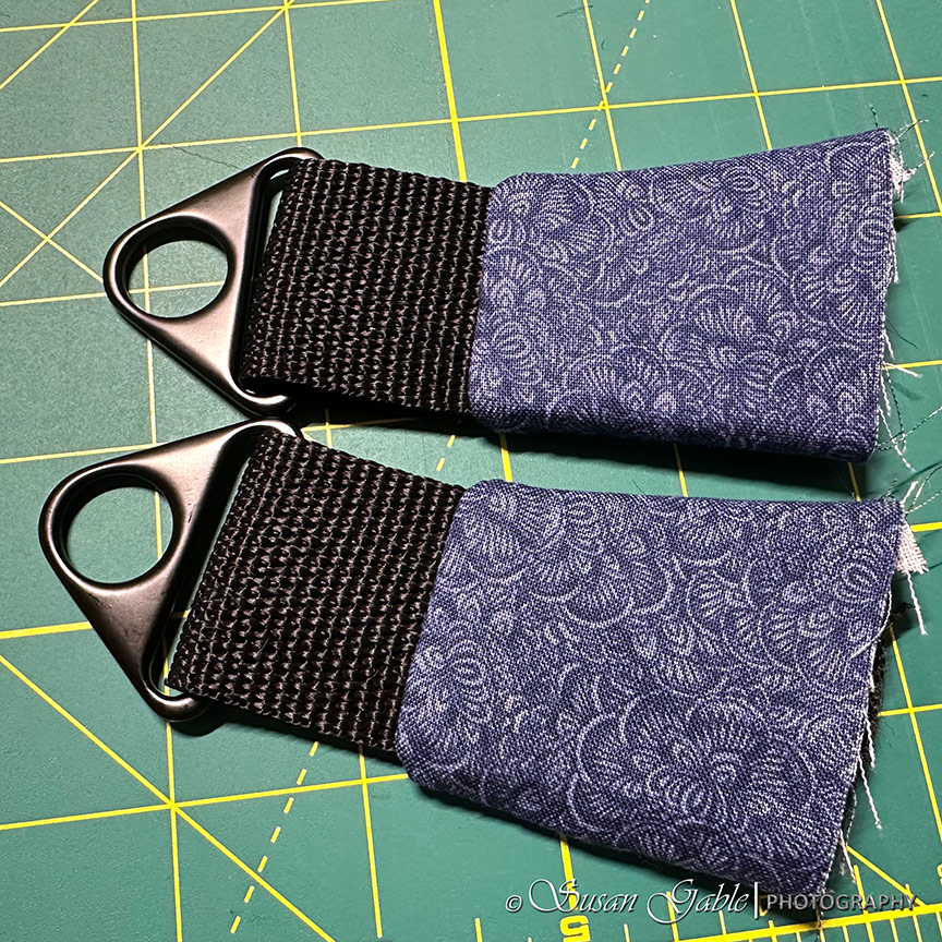 I’m very particular about my shoulder straps used with a bag. They need to be soft and wide. I’ve been thinking about changing the pattern a tiny bit. The pattern uses a webbing that is permanently attached to one side of the bag. The other side has a D-ring where the shoulder strap could be hooked. I’m not a big fan of permanently attached straps.