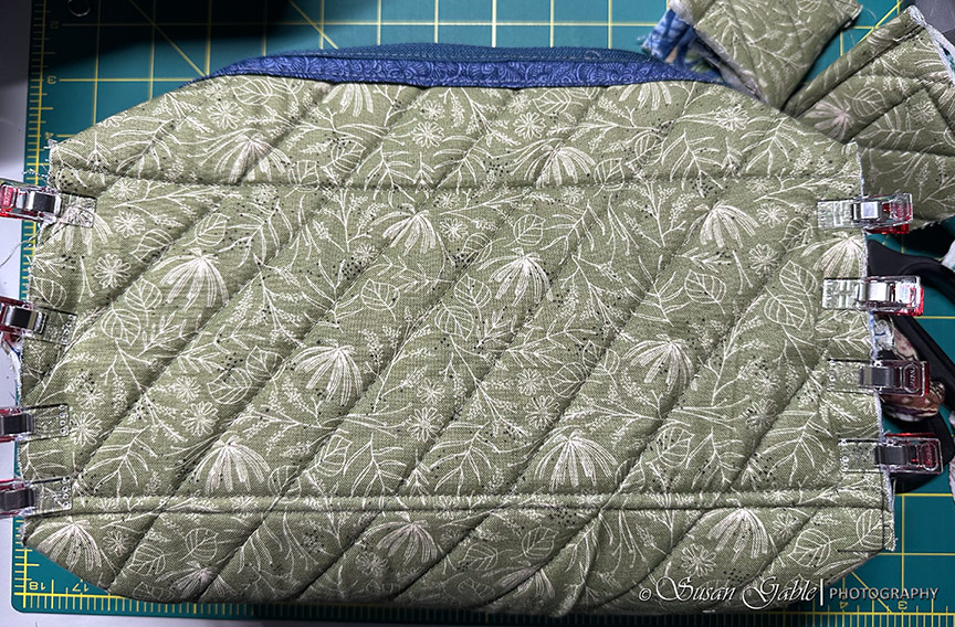 I did not sew the two back edges as that is where the strap tabs will be inserted. I wasn’t ready to finish the edges as I was waiting for a small package to arrive at my studio.