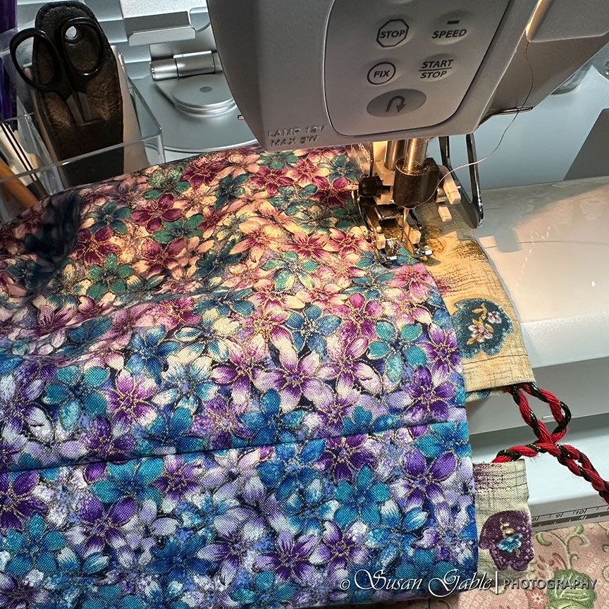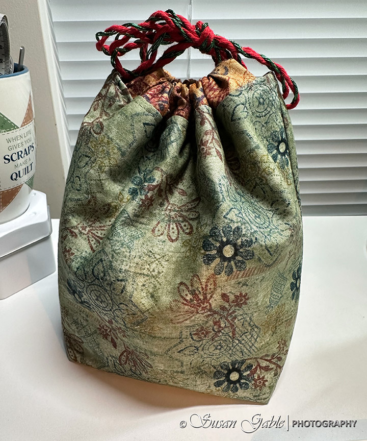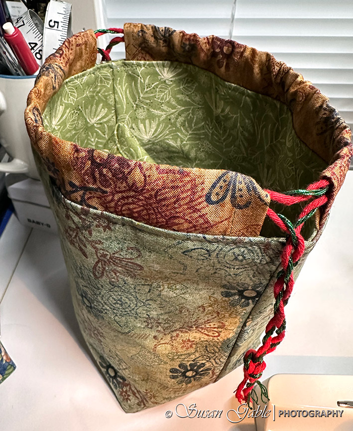 I was in the midst of sewing my gift bag when I realized I had cut my lining quite a bit larger than the main part of the bag. I tried to modify the lining and decided to stop and basically re-cut my lining. This is why my first attempt is always called a test project. No stress. I just need to remember to measure twice and cut once.