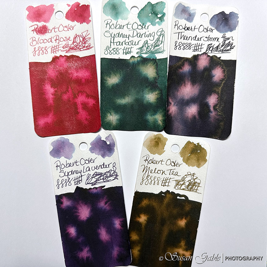 Here are my swatch cards that represent the ink I’m currently using in my pens. I always enjoy seeing the underlying colors on my swatches.