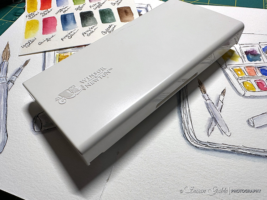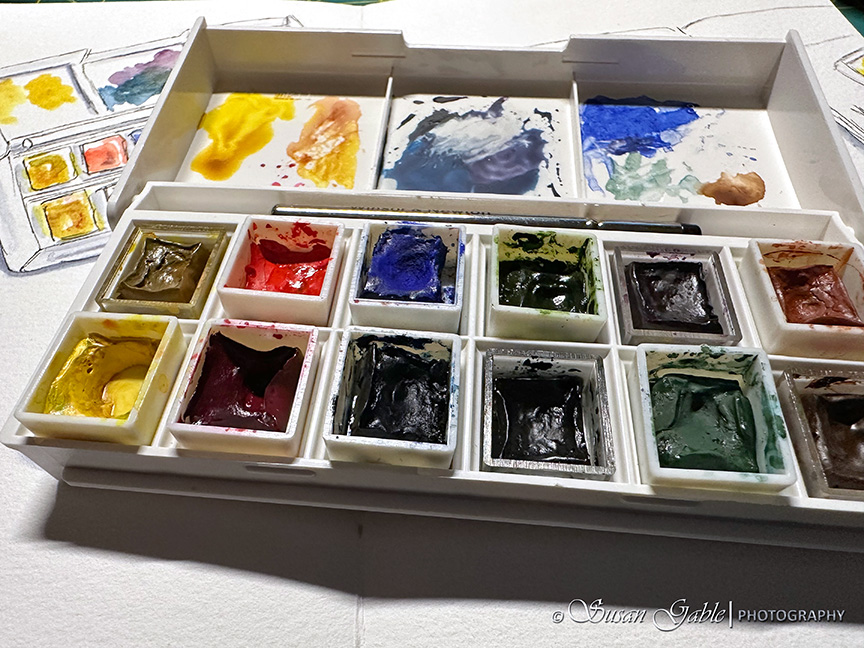 This large palette added a bit of chaos to my world. Did I really need to have all those colors staring back at me? I found that using a water brush with this palette was a good combination for loose sketches. I can just pick up the paint color and apply it directly to my paper. There was no need to mix colors as there was bound to be a color that came close in my 24 collection of pans.